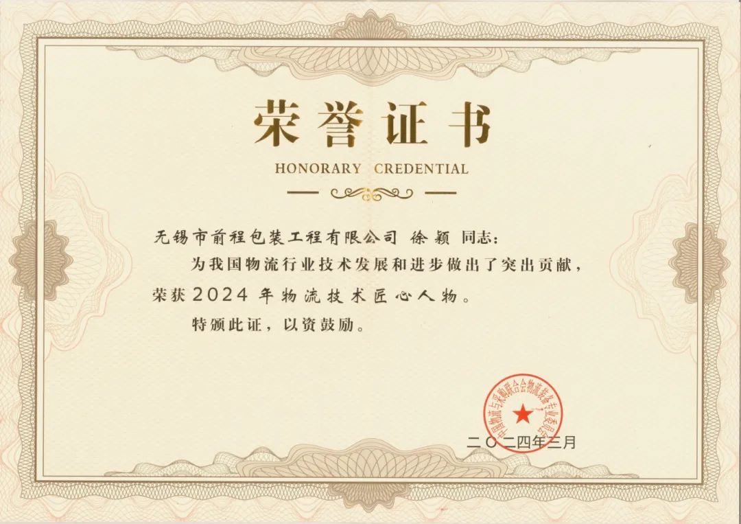 近年來,徐穎總經(jīng)理帶領(lǐng)技術(shù)研發(fā)團隊組建了江蘇省綠色智能包裝工程技術(shù)研究中心,并成功通過省級工程技術(shù)研究中心認定,對我國綠色智能包裝技術(shù)及企業(yè)創(chuàng)新發(fā)展注入新動力。通過開發(fā)新的代木材料,幫助客戶努力降低包裝成本,為客戶創(chuàng)造價值,為減少林業(yè)資源消耗及其他包裝原材料行業(yè)的可持續(xù)發(fā)展作出了積極的努力;通過推進循環(huán)包裝及減量化,為新能源、成套裝備、高端醫(yī)療器械等新興產(chǎn)業(yè)助力。公司獲得“創(chuàng)新示范領(lǐng)軍企業(yè)”、江蘇省“專精特新”企業(yè)等多項榮譽稱號,也收獲了眾多客戶的認可和信任。此次,徐穎總經(jīng)理榮獲”物流技術(shù)匠心獎”亦是行業(yè)對前程公司不斷創(chuàng)新、穩(wěn)健發(fā)展的高度肯定。